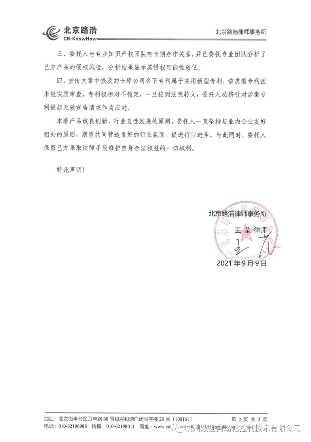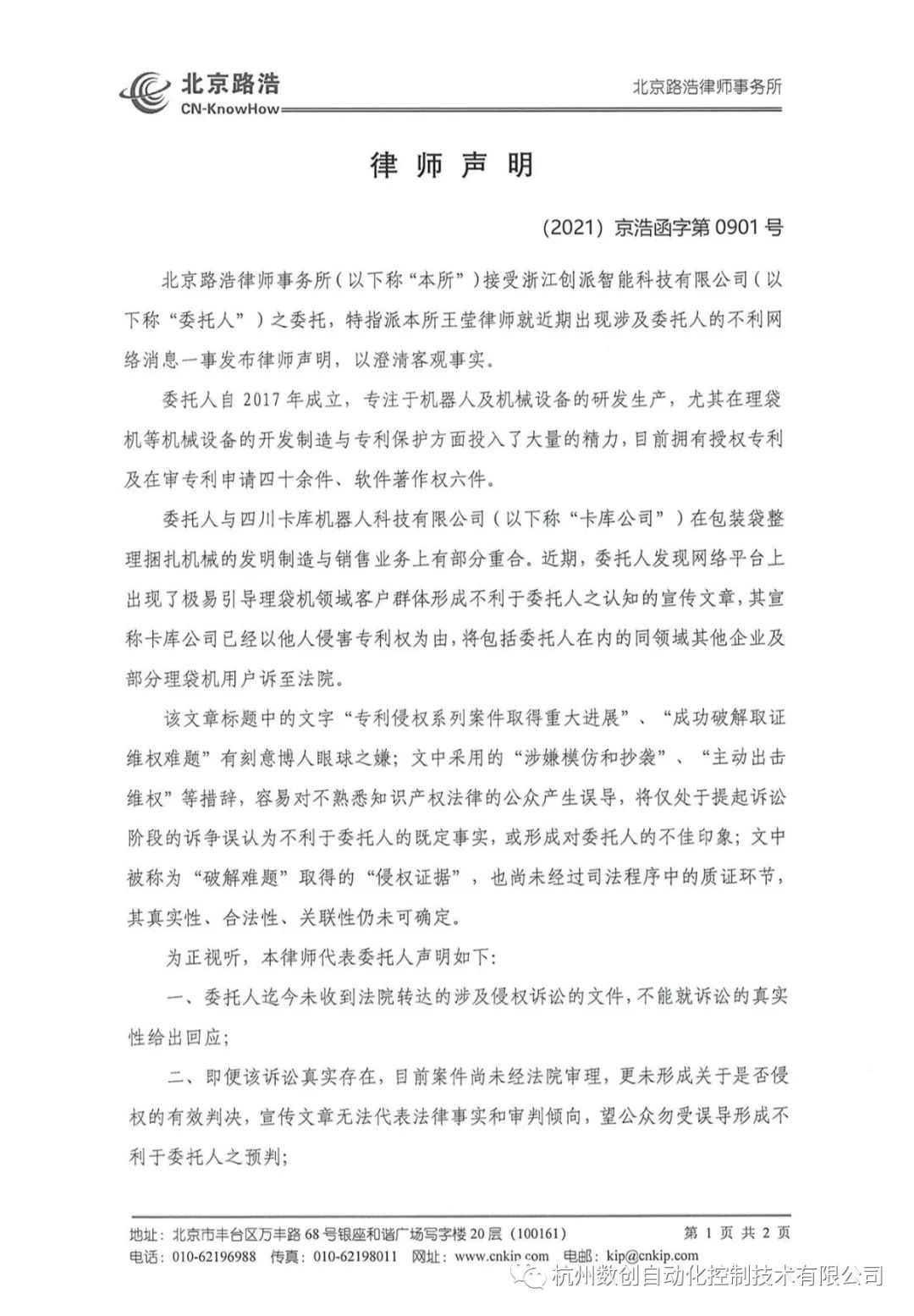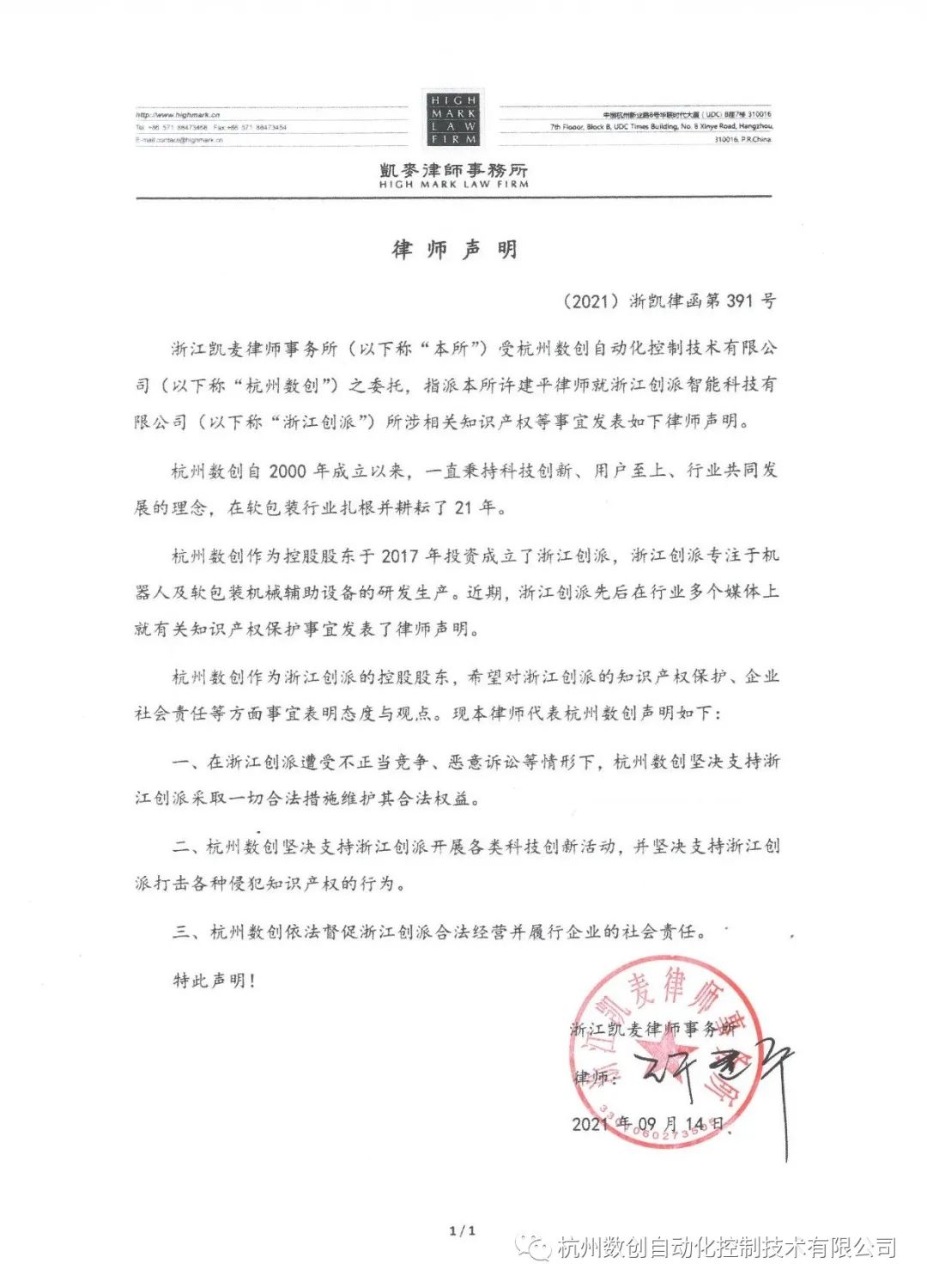 浙江凯麦律师事务所(以下简称“本所”)受杭州数创自动化控制技术有限公司(以下简称“杭州数创”)之委托,指派本所许建平律师就浙江创派智能科技有限公司(以下简称“浙江创派”)所涉相关知识产权等事宜发表如下律师声明。