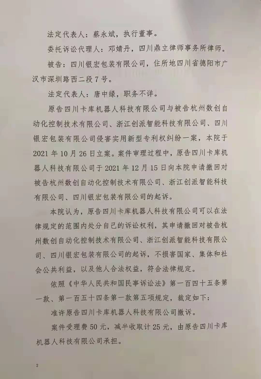原告四川卡库机器人科技有限公司与被告杭州数创自动化控制技术有限公司、浙江创派智能科技有限公司、四川银宏包装有限公司侵害实用新型专利权纠纷一案,本院于2021年10月26日立案。案件审理过程中,原告四川卡库机器人科技有限公司于2021年12月15日向本院申请撤回对被告杭州数创自动化控制技术有限公司、浙江创派智能科技有限公司、四川银宏包装有限公司的起诉。