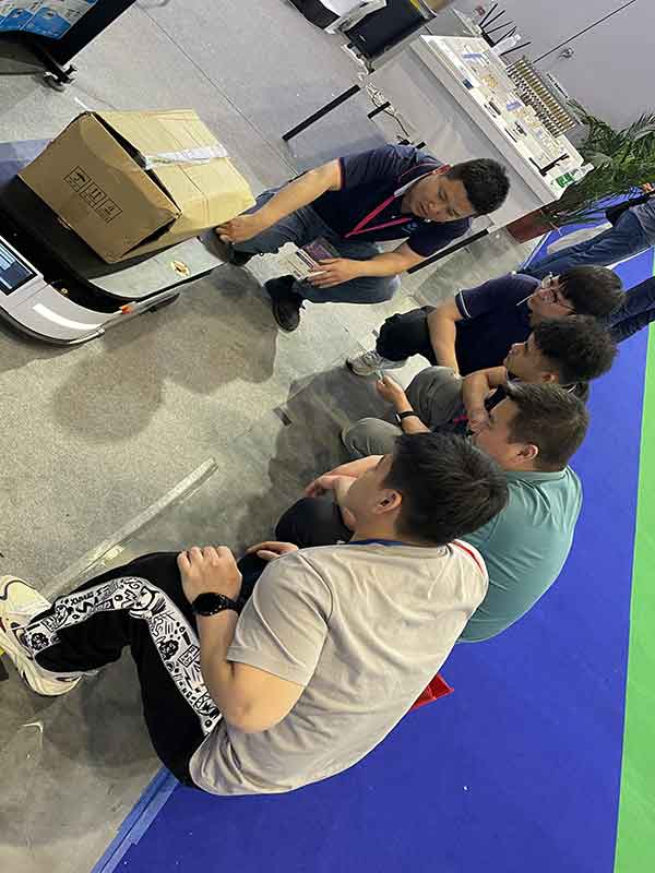 首先是在制袋机上通过AGV上下料小车,实现了自动上下料的动作,此台AGV载重600KG,可以很大程度上减轻我们的一些重体力劳动;